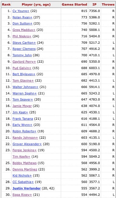 The Baseball-Reference.com list has 24 HOFers in the top 30 for games started. The six un-enshrined pitchers that qualify and are in the top 30 are: